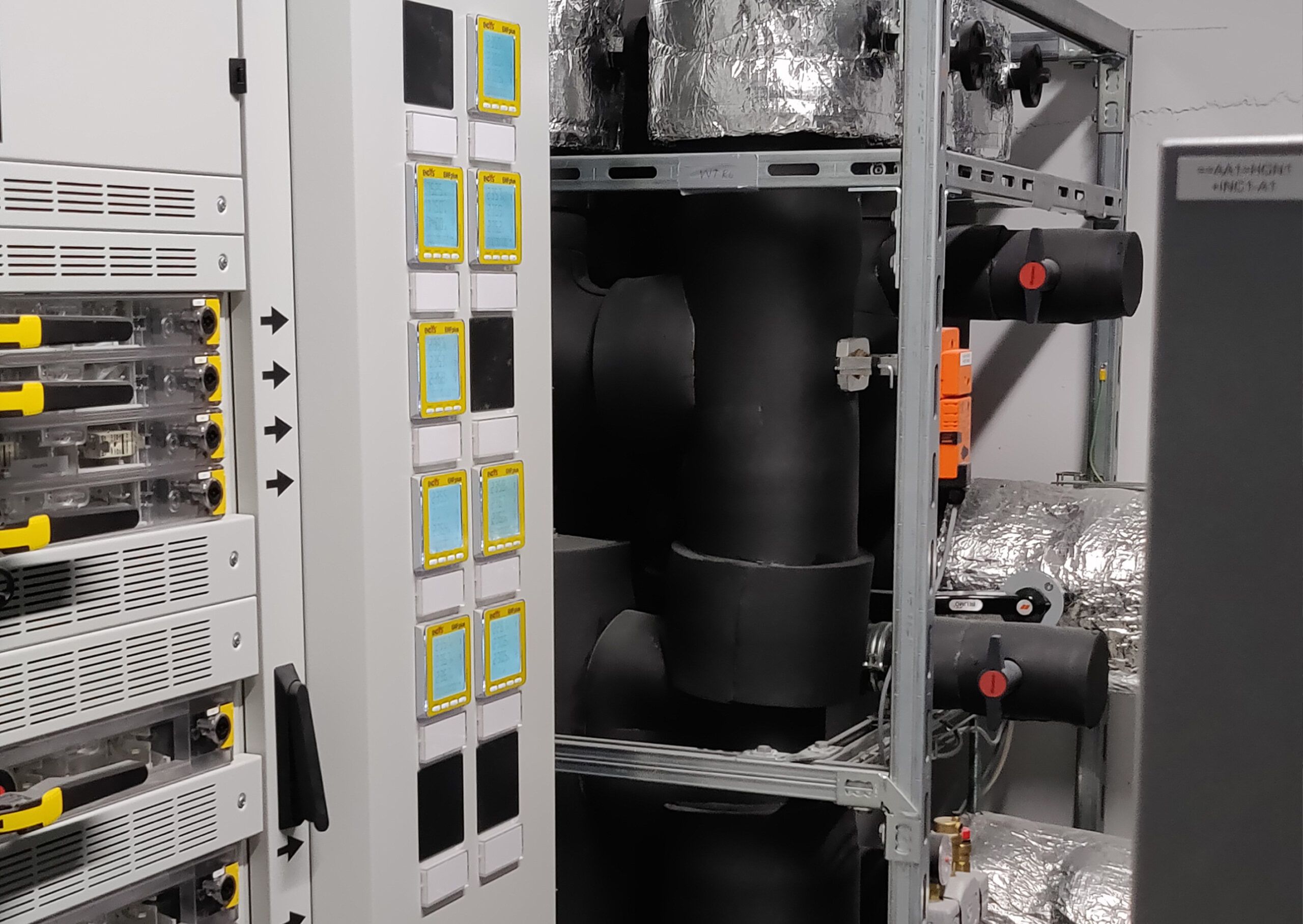 Die HSU-140 besteht aus einem Quellenmanagement-Modul (QMM), welches die zur Verfügung stehenden Energiequellen optimal reguliert, einem Wärmepumpen-Modul Primär (WPMP) sowie einem Wärmepumpen-Modul Sekundär (WPMS), welche als Schnittstellen zwischen dem Quellenmanagement-Modul, der Wärmepumpeneinheit sowie der sekundärseitig verbauten Kühl- und Heizungspuffer eingesetzt werden. Sämtliche steuerungs- und regelungstechnisch relevanten Komponenten wie, Hocheffizienzpumpen, Stellantriebe für Hubventile, Temperatursensoren, Wärmemengenzähler, Drosselklappen, Durchflusssensoren wurden auf einen in der HSU verbauten Schaltschrank aufgelegt und können vor Ort steckerfertig an die übergeordnete Steuerungs- und Regelungseinheit Vitocontrol 200-M der Firma Viessmann angeschlossen werden. Durch die Verwendung der vorkonstruierten hydraulischen Unterstützungseinheiten konnte die Firma Metternich Haustechnik eine Zeitersparnis von fast einem Monat an hydraulischen sowie elektrotechnischen Installationsarbeiten vor Ort erzielen.